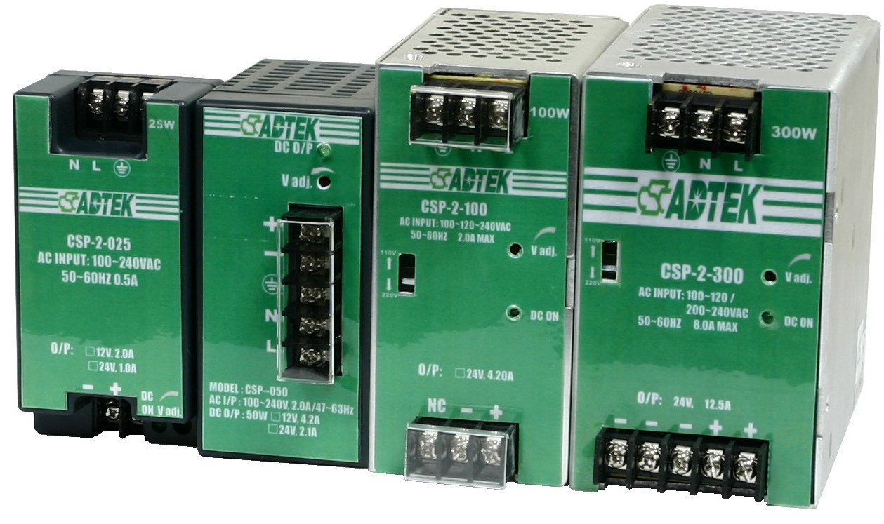CSP-2 Switching Power Supply * A wide range of selectable to meet various application. * Power rating from 20 Watts to 500 Watts. * Output Voltage 5Vdc, 12Vdc, 24Vdc. * Compact Size with Din Rail mounting. |